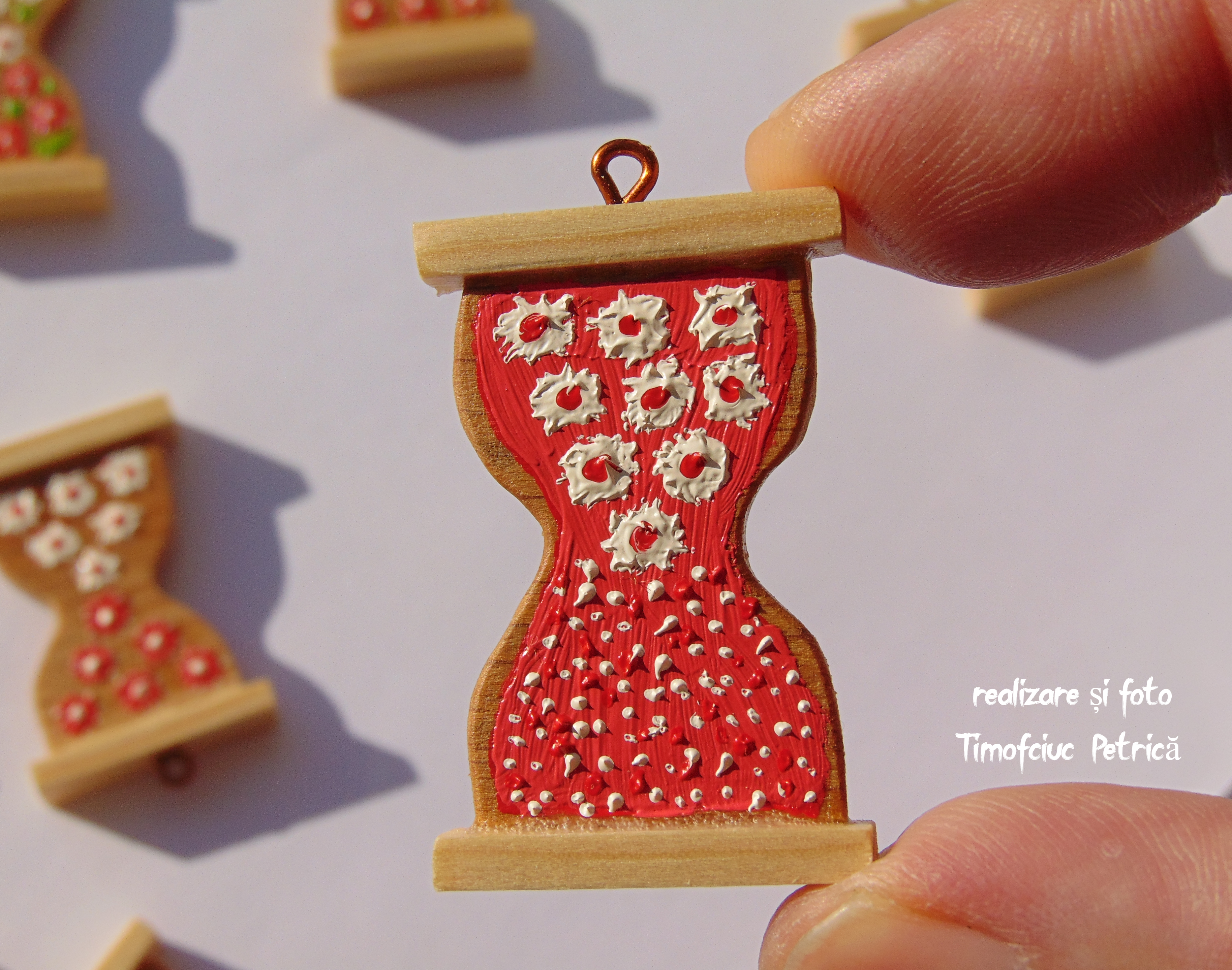 Mărțișor realizat din lemn, tăiat la traforaj, pictat în vopsele pe bază de ulei.